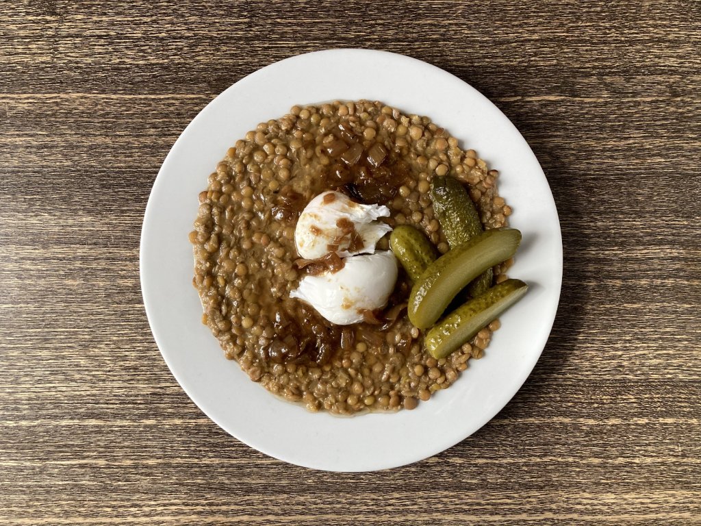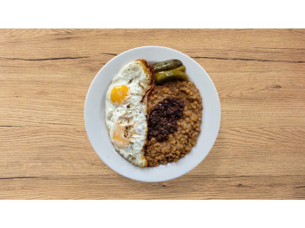 Cibulový základ na sádle s čočkou na sladkokyselo, pošírované vejce a smažená cibulka.