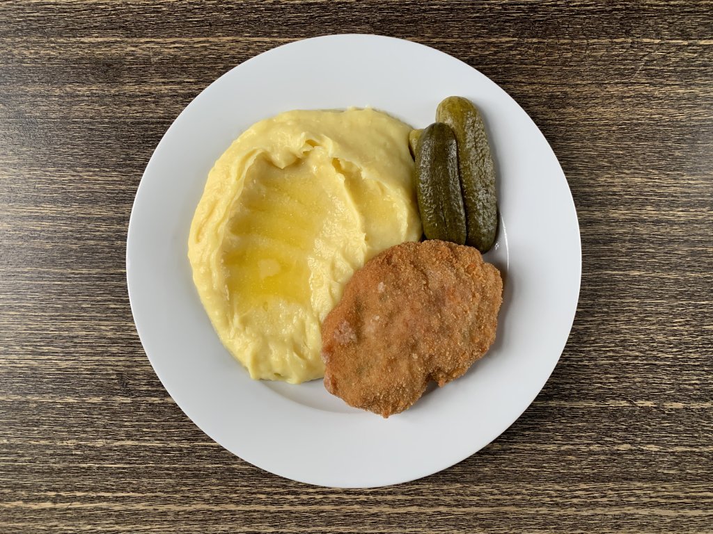 Namletý vepřový bok s nastrouhaným sýrem a petrželkou, obalený v trojobalu a usmažený v oleji. S bramborovou kaší a nakládanou kyselou okurkou.