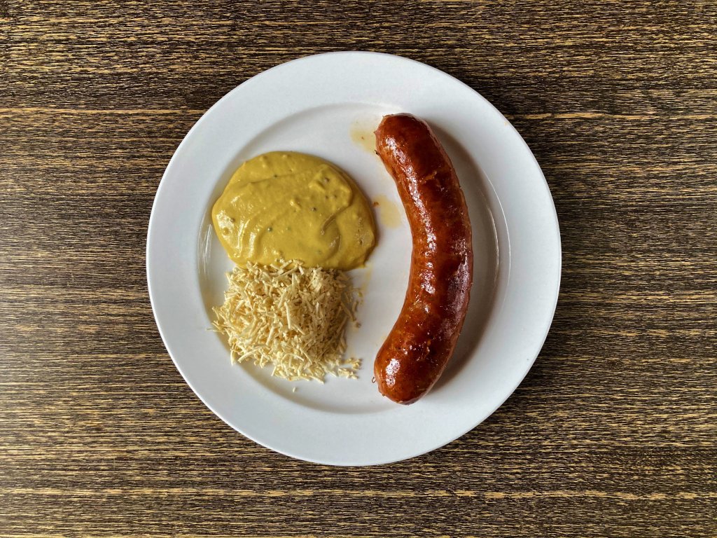 Opečená přeštická klobása z Amasa s čerstvým křenem, naší hořčicí a chlebem.