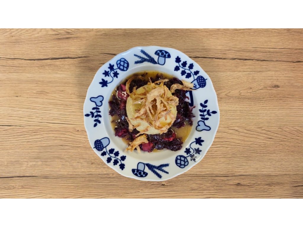 Velký bramborový knelík , plněný trhanou kachnou , červené zelí cibulka 1 ks